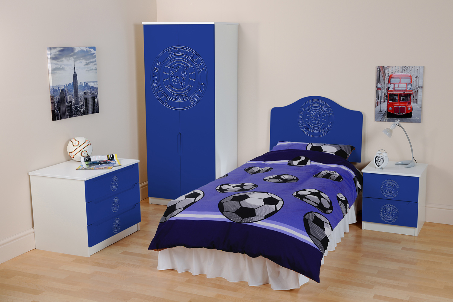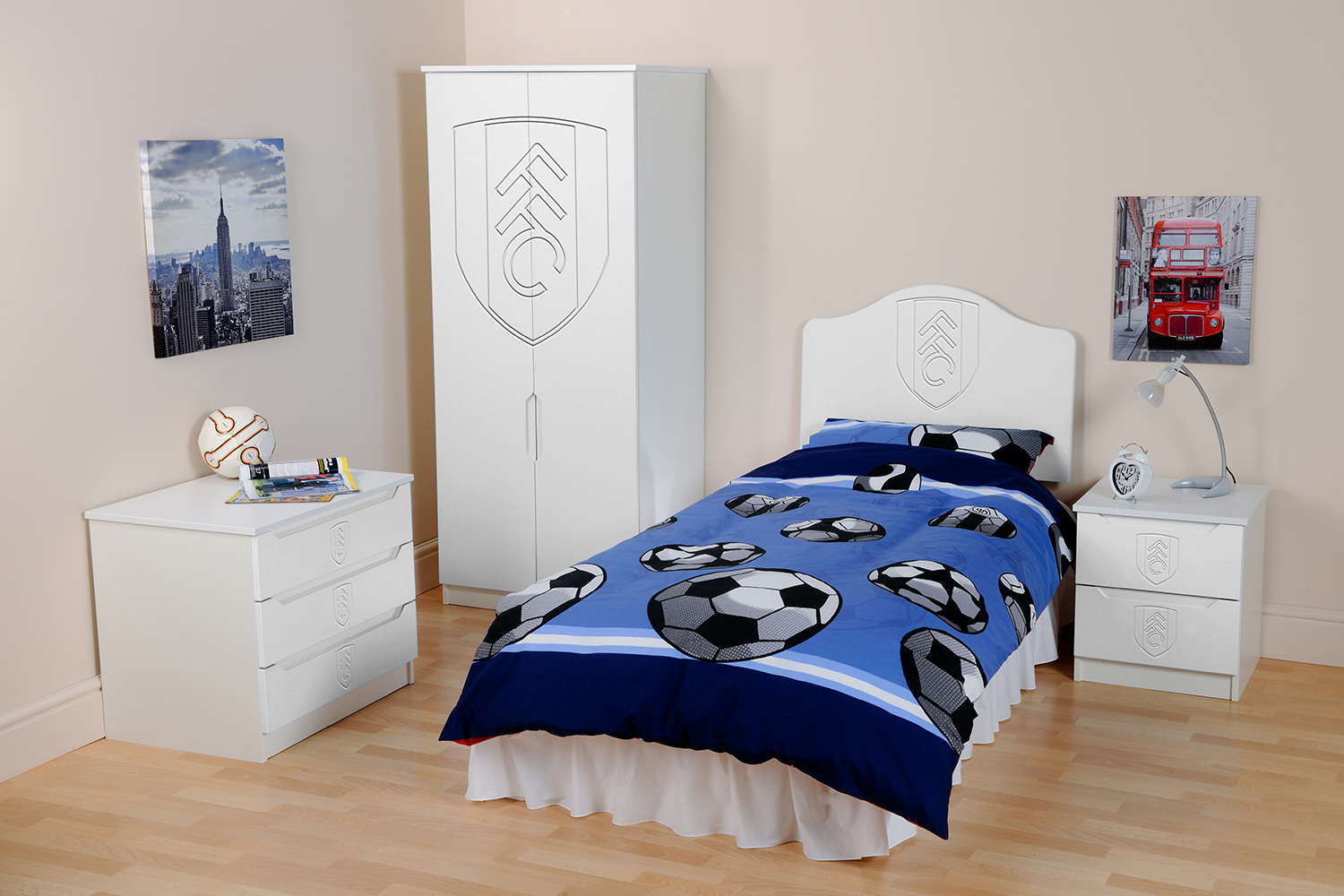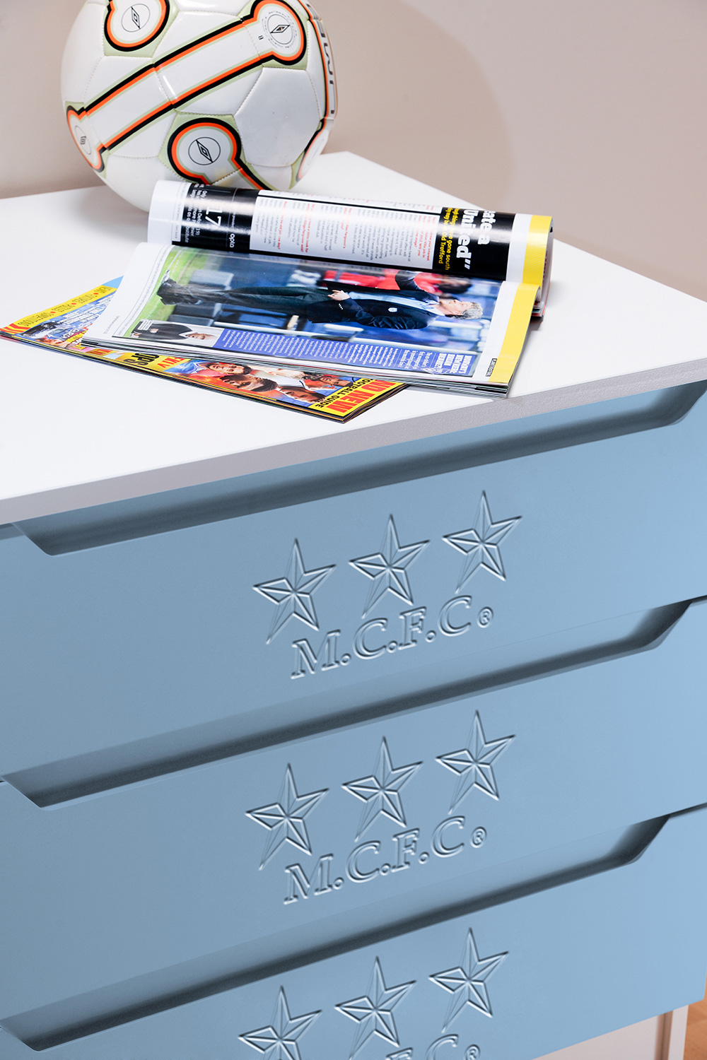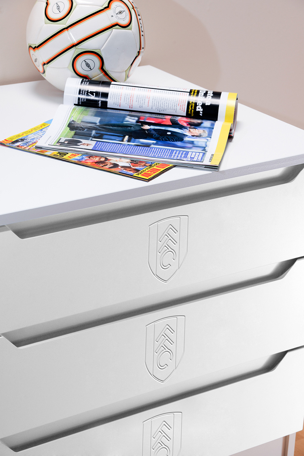 Now fans can hang their home and away strips in a Kit Locker wardrobe, stash their socks in Score Drawers and keep their match day programmes in bedside Trophy cabinets. At full time there’s no where better to rest a fan’s head than against a Headers headboard. The range is available as individual freestanding items, as a suite or as replacement door or drawer fronts for suitable existing furniture.