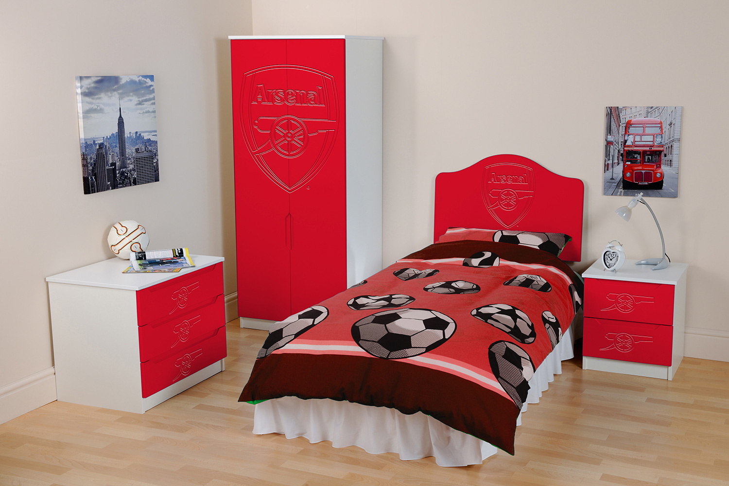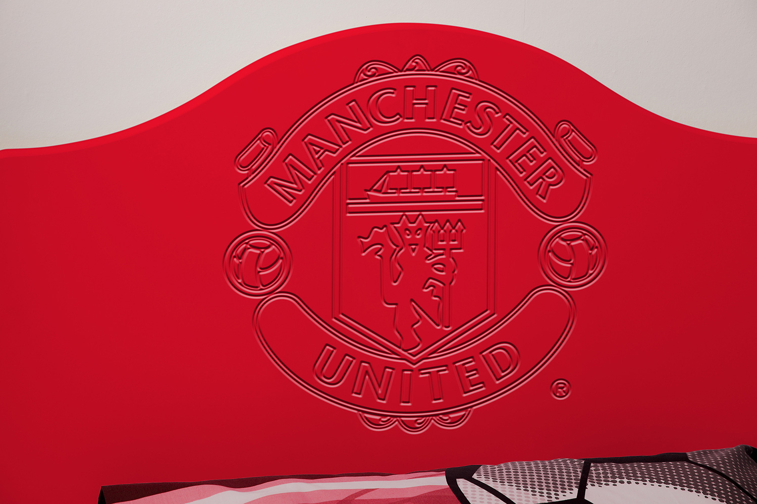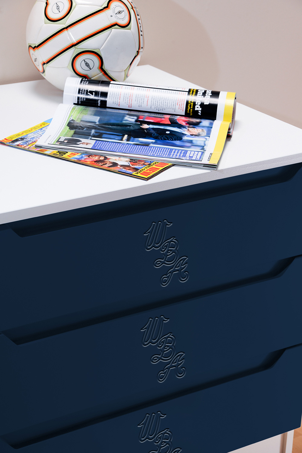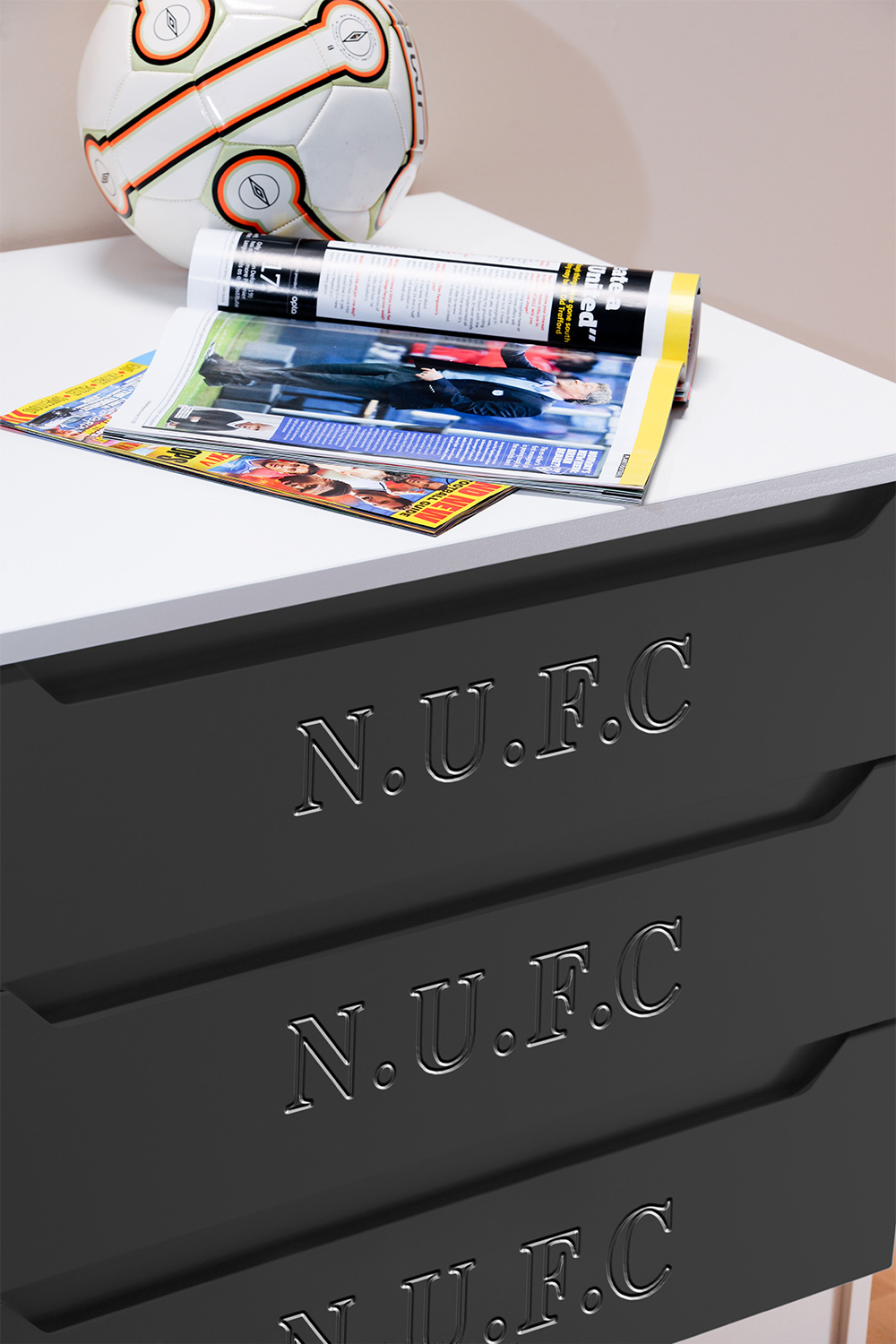 Now fans can hang their home and away strips in a Kit Locker wardrobe, stash their socks in Score Drawers and keep their match day programmes in bedside Trophy cabinets. At full time there’s no where better to rest a fan’s head than against a Headers headboard. The range is available as individual freestanding items, as a suite or as replacement door or drawer fronts for suitable existing furniture.