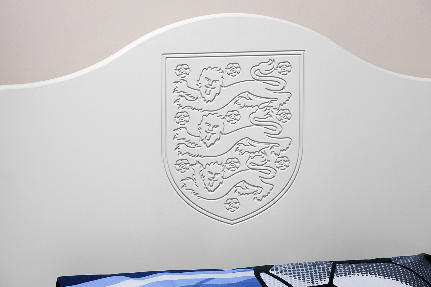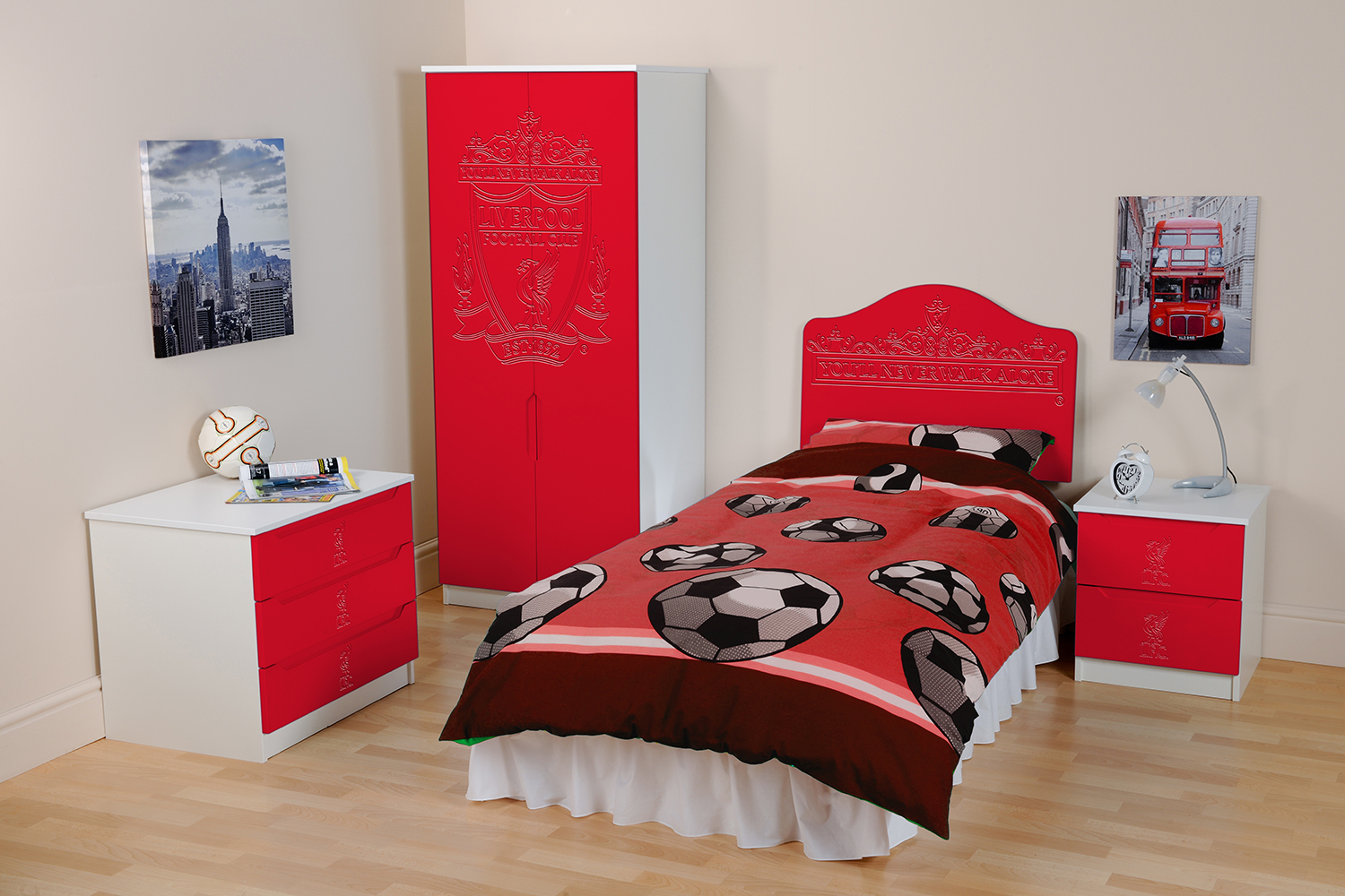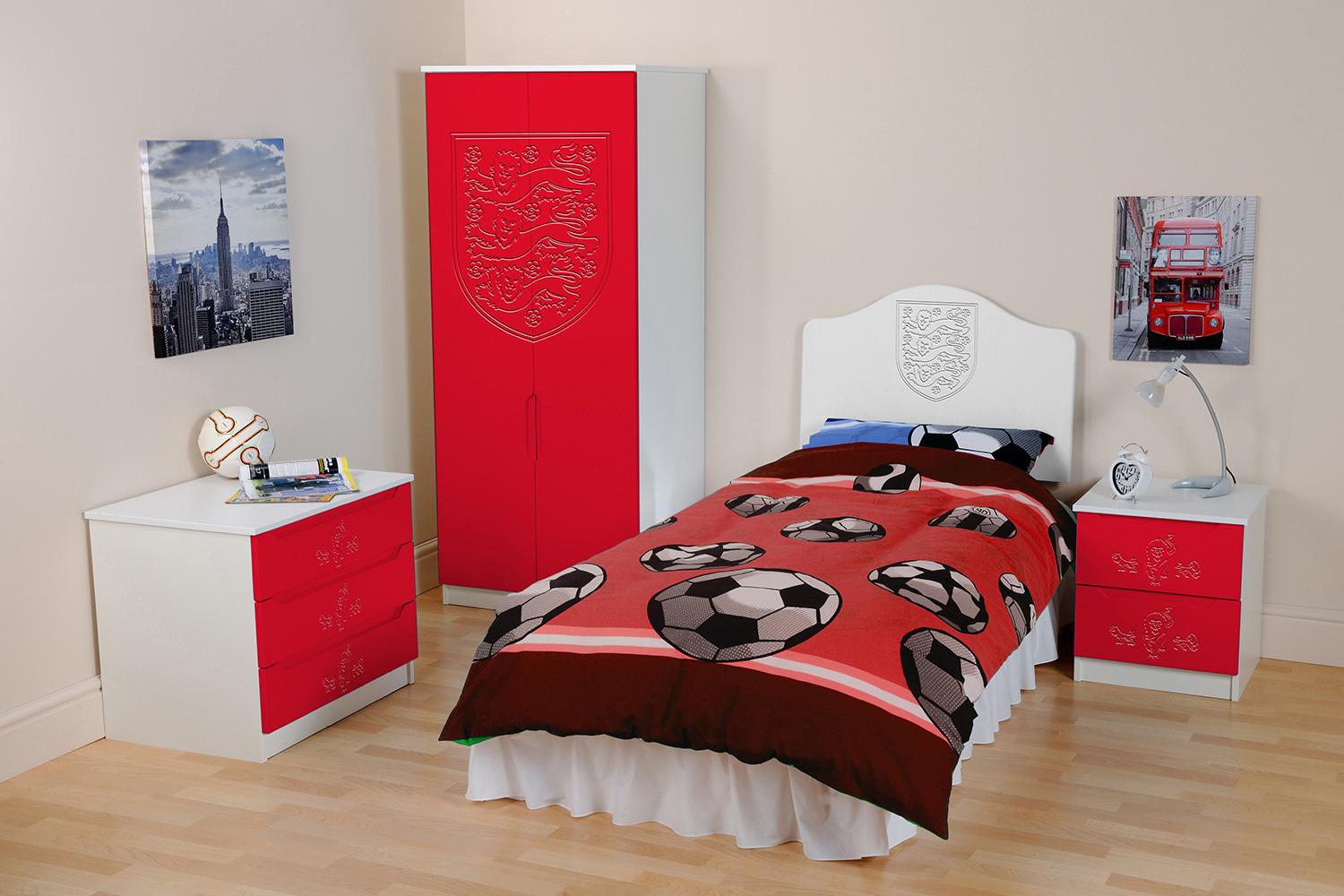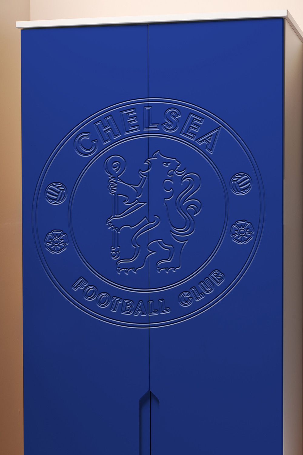 Now fans can hang their home and away strips in a Kit Locker wardrobe, stash their socks in Score Drawers and keep their match day programmes in bedside Trophy cabinets. At full time there’s no where better to rest a fan’s head than against a Headers headboard. The range is available as individual freestanding items, as a suite or as replacement door or drawer fronts for suitable existing furniture.