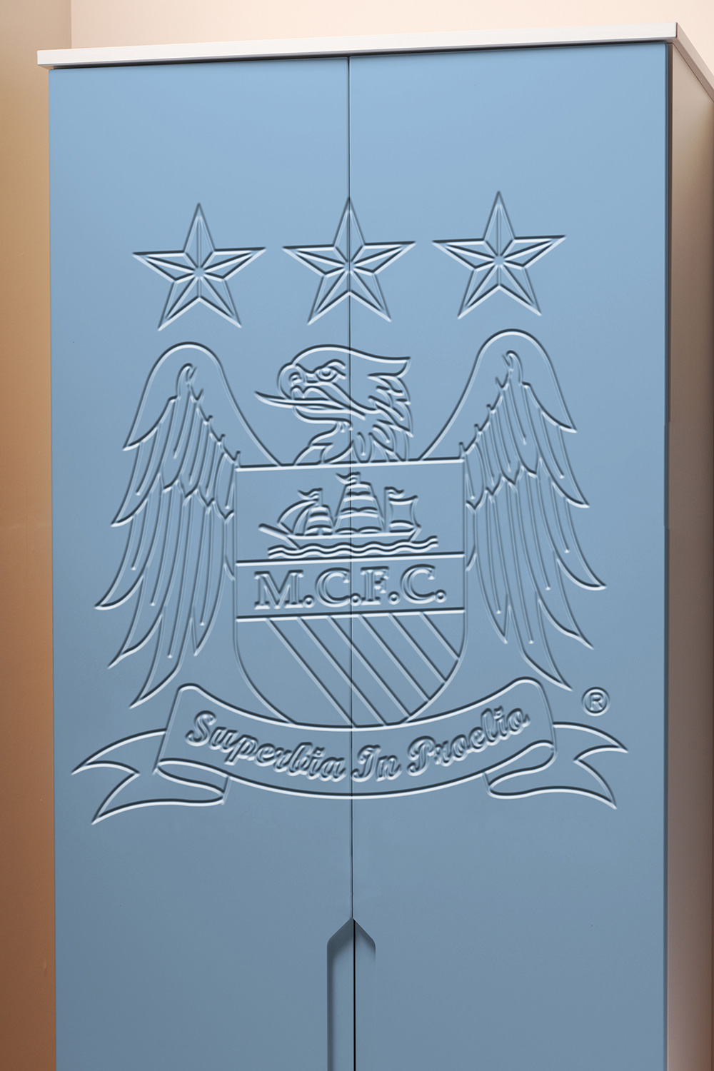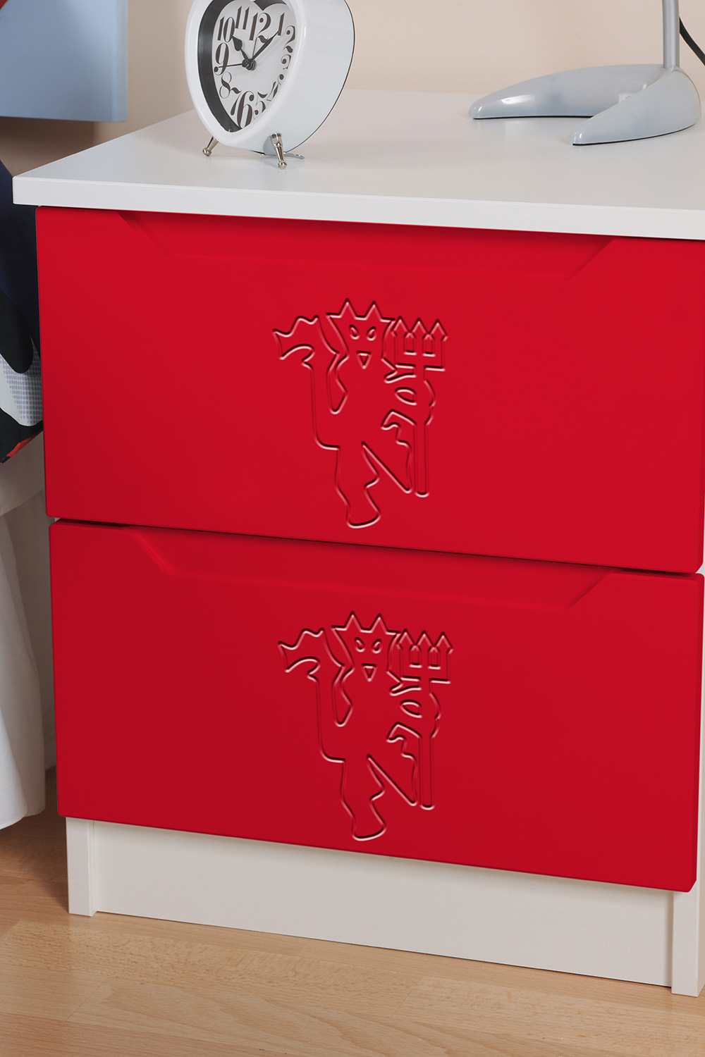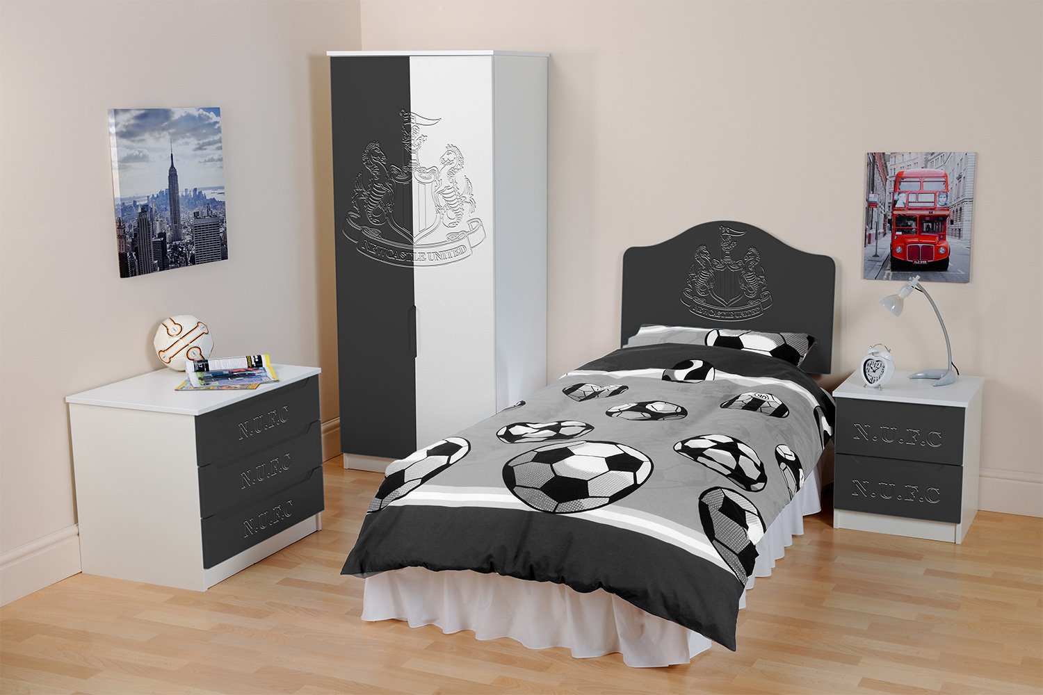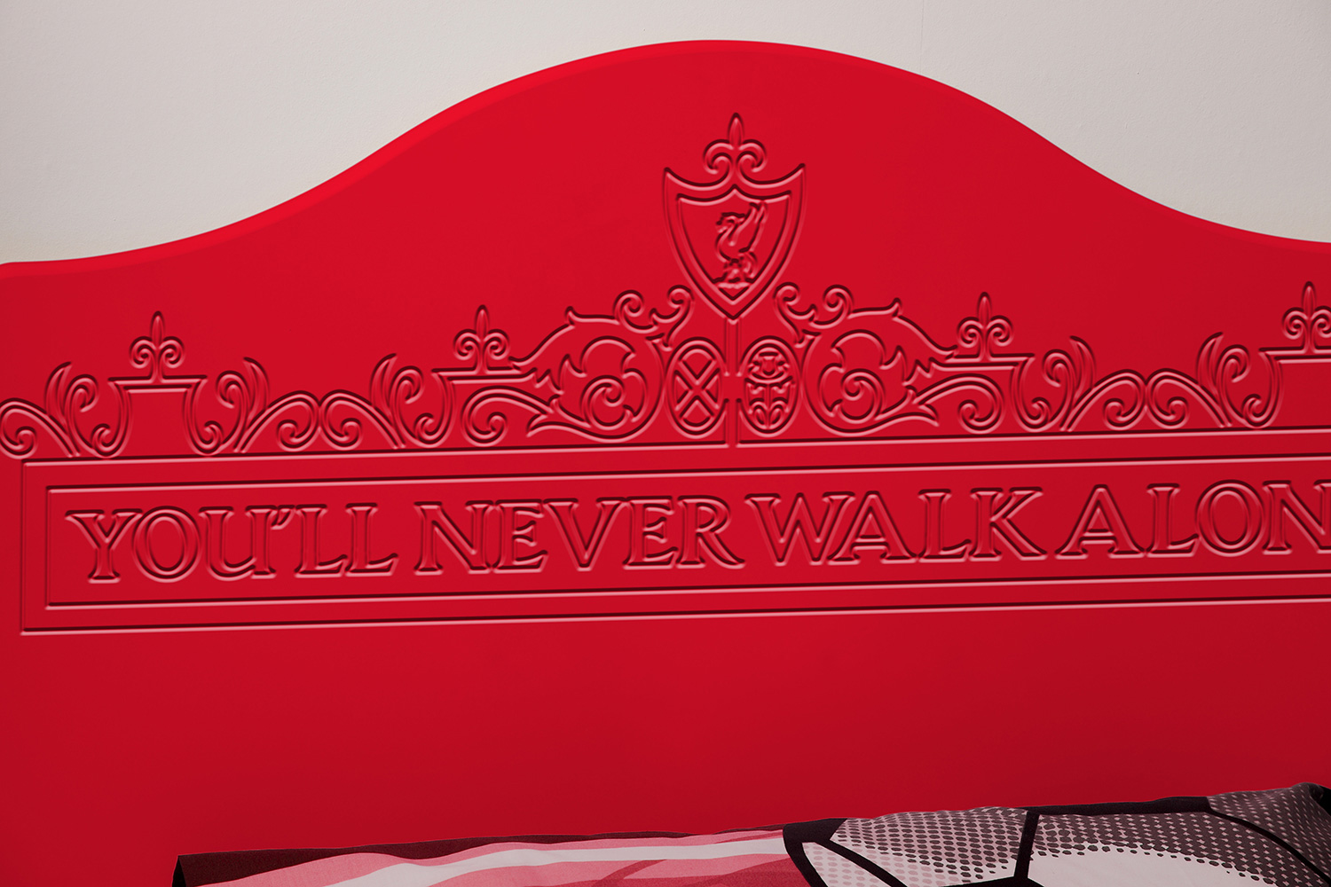 Now fans can hang their home and away strips in a Kit Locker wardrobe, stash their socks in Score Drawers and keep their match day programmes in bedside Trophy cabinets. At full time there’s no where better to rest a fan’s head than against a Headers headboard. The range is available as individual freestanding items, as a suite or as replacement door or drawer fronts for suitable existing furniture.
